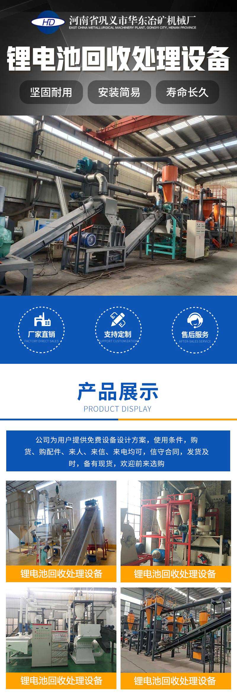 廢手機鋰電池回收處理設(shè)備主要采用物理回收方法,輔以“三廢”處置措施,具有綠色低碳、節(jié)能環(huán)保、無二次污染等特點,并兼顧經(jīng)濟與環(huán)保效益,既實現(xiàn)有價組分的利用,又可對有害組分無害化處理。整個回收過程全部實現(xiàn)了工業(yè)自動化,回收效率高,處理能力強,每小時處理量為500千克,年處理量達到5000噸,廢舊鋰電池有價組分回收利用率達90%以上。